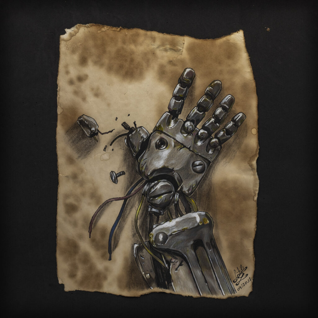 Desenho feito com lápis de cor sobre papel envelhecido por café.