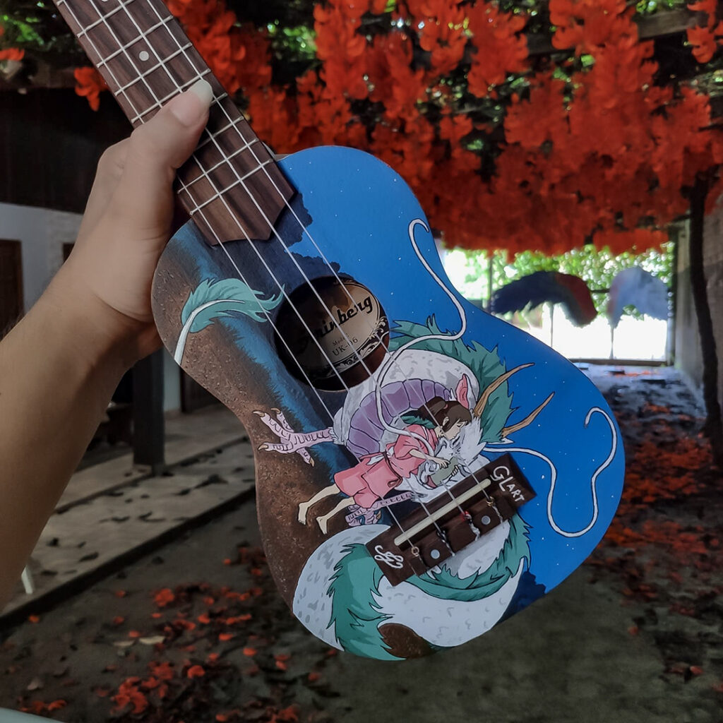 Técnica de tinta acrílica sobre madeira do Ukulele.