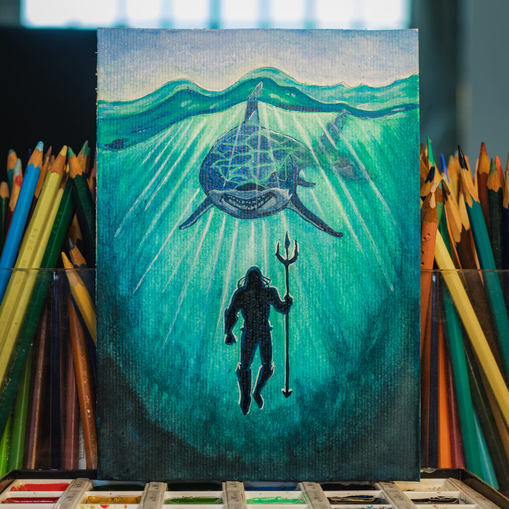 Desenho feito com utilização de técnicas mistas com marcadores, lápis e tintas.