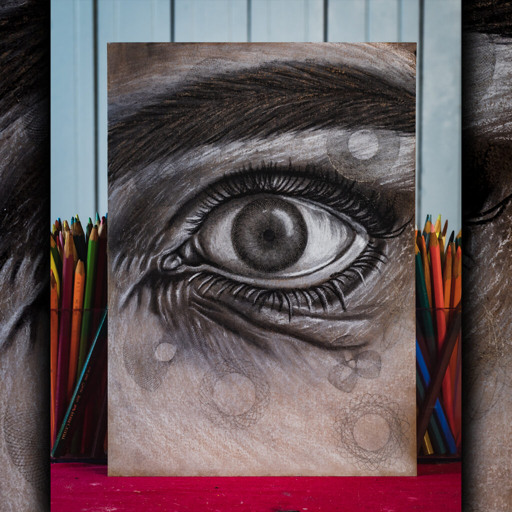 Técnica somente com lápis 6B sobre chapa de gesso cartonado.
